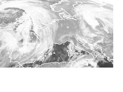 Tiefdruckgebiete über dem Atlantik, sowie über Osteuropa sorgen für dichte Wolken mit Regen, teils auch Schnee in weiten Teilen Europas. Dazwischen ist es von Skandinavien über Deutschland bis in den Norden von Italien unter leichtem Zwischenhocheinfluss nahezu wolkenfrei und meist trocken. (Bildquelle: NERC Satellite Receiving Station, Dundee University, Scotland, http://www.sat.dundee.ac.uk/)