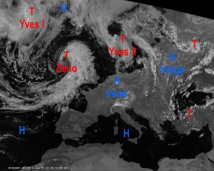 Auf dem heutigen Satellitenfoto sind zwei ausgeprägte Tiefdruckgebiete über den Britsichen Inseln und über Skandinavien zu sehen. Hierbei kommt es verbreitet zu Schauern und teils auch zu kräftigen Gewittern. Auch im westlichen Russland und weiter bis zum Schwarzen Meer sorgt schwacher Tiefdruckeinfluss für leicht wechselhaftes Wetter mit einzelnen Schauern. Im übrigen Europa ist es bis auf vereinzelte Schauer oder Gewitter in den Alpenländern weitgehend heiter und trocken.
