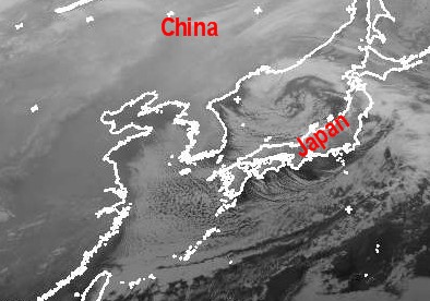 Auf dem Satellitenfoto ist nur wenige 100 Kilometer nordwestlich von Japan ein pazifisches Tiefdrucksystem auszumachen, das in Japan für teils dichte Bewölkung mit einzelnen Regen- im Norden auch für Schneeschauer sorgt. Vielerorts kann die Bewölkung aber auch für längere Zeit auflockern und es bleibt trocken. Im weiteren Verlauf schwächt sich das Tief etwas ab und sorgt nur noch gebietsweise für etwas Regen oder Schnee.