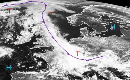 Ein Tiefdrucksystem mit drei Zentren (bei Island, nördlich von Schottland und in Ostfrankreich) erstreckt sich mit seiner Bewölkung am Freitag Mittag quer über Europa. Es ist eingeschlossen von zwei Hochdruckgebieten (über der Ostsee und westlich von Spanien bis zu den Azoren). In dem Bereich starker Bewölkung kommt es häufig zu Regen oder auch Gewittern. Voraussichtlich bleibt die Bewölkung am Wochenende recht ortsfest, so dass es in Deutschland meist freundlich und trocken ist. Im Südwesten kann es durch den Tiefdruckeinfluss aber zu Schauern oder Gewittern kommen. (Bildquelle: Copyrigt EUMETSAT, NERC Satellite Receiving Station, University of Dundee)