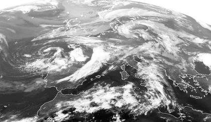 Das Satellitenbild zeigt Europa übersät von Tiefdruckgebieten. Eines liegt über der südlichen Ostsee, ein weiteres südlich von Irland. Westlich des Nordkaps zeigt sich ein weiteres Tief, über dem Mittelmeer und Nordafrika befindet sich eine gealterte Kaltfront. Schön zu erkennen sind wolkenfreie Gebiete zwischen den Tiefs, wie z. B. im Nordwesten Deutschlands und Benelux. Diese entstehen durch absinkende Luftbewegung, welche ihrerseits durch divergente Strömung in Bodennähe hervorgerufen wird.