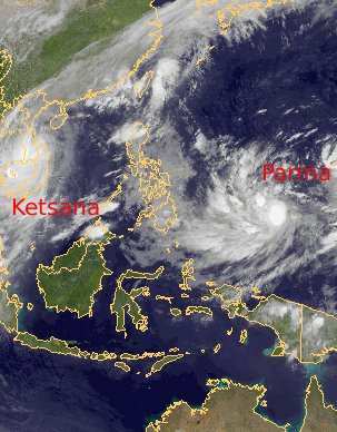 Der Taifun 'Ketsana' liegt derzeit über dem Landesinneren von Südostasien, wo er sich deutlich abgeschwächt hat. Es kommt aber teils noch zu ergiebigen Regenfällen. Unterdessen liegt östlich der Philippinen der neue Tropensturm 'Parma', der sich voraussichtlich ebenfalls zum Taifun verstärken wird. Derzeit erreicht er in Böen bis zu 120 km/h. Nach den letzten Berechnungen zieht er jedoch weiter nach Norden und erreicht damit die Philippinen nicht.