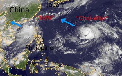 Reges Wirbelsturmtreiben herrscht derzeit im Nordwest-Pazifik. Während im Südchinesischen Meer der Tropensturm '16W' vom Wind her zwar schwach ist (Mittelwind etwa 65 km/h), kommt es doch zu sehr kräftigen Regenfällen. Der Tropensturm 'Choi-Wan', der noch weit draußen vor der Küste Chinas liegt, weist dagegen Windgeschwindigkeiten von 100 km/h (in Böen bis 130 km/h) auf und verstärkt sich weiter. Nach aktuellen Berechnungen könnte er auf Taiwan zuziehen.