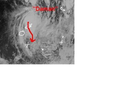 Die dichten Wolken über den Fidschi-Inseln gehören zu dem Tropensturm 'Daman'. Dieser hat sich weiter verstärkt und erreicht zurzeit mittlere Windgeschwindigkeiten von 185, in Böen 232 km/h. Berechnungen zufolge zieht er heute über die östliche der beiden Hauptinseln hinweg und schwächt sich etwas ab. Dabei kommt es zu kräftigen und ergiebigen Regenfällen und Sturm. Sein Endziel ist noch unklar. (Bildquelle: NERC Satellite Receiving Station, Dundee University, Scotland, http://www.sat.dundee.ac.uk/)