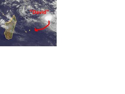Der Tropensturm 'David' im Südwesten des Indischen Ozeans ist auf dem Satellitenbild von Mittwoch früh gut zu erkennen. Zurzeit erreicht er mittlere Windgeschwindigkeiten von 102, in Böen 130 km/h. Berechnungen zufolge soll er sich nicht weiter verstärken und Richtung Südwesten Ziehen. Dabei gelangen in den nächsten Tagen die Inseln Mauritius und Réunion in seinen Einflussbereich.