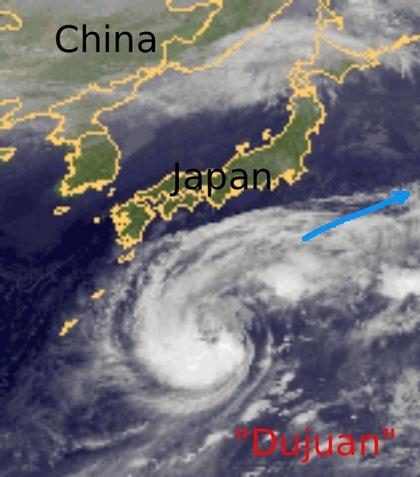 Tropensturm 'Dujuan' liegt heute Mittag mit Zentrum südlich von Japan. Es weist mittlere Windgeschwindigkeiten von 85 km/h auf, in Böen werden bis zu 105 km/h erreicht. Unter den Wolken fällt zum Teil ergiebiger Regen. Vorausichtlich zieht der Sturm jedoch in nordöstliche Richtung weiter, sodass Japan weitgehend verschont bleibt. Allenfalls die südlichen Küstengebiete können von Ausläufer des Sturms gestreift werden.