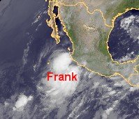Der tropische Sturm 'Frank' liegt zur Zeit südwestlich des mexikanischen Festlands und bringt mit seinen Ausläufern vor allem an der Pazifikküste teils kräftigen Regen und Wind. Auf seinem weiteren Weg nach Nordwesten streift er mit seinen Ausläufern auch die Halbinsel Niederkalifornien und wird sich dabei noch etwas verstärken.
