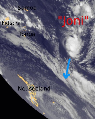 Der Tropensturm 'Joni' hat sich bei Windgeschwindigkeiten von etwa 95 km/h im Mittel und 120 km/h in Böen seit gestern etwas verstärkt. Weiterhin zieht er aber kaum über stärker bewohnte Inseln. Auf seinen Südkurs liegen auch in den nächsten Tage kaum größere Inseln, allenfalls die Chatham-Insel östlich von Neuseeland konnte von der Zugbahn des Wirbelsturms gekreuzt werden. Neuseeland erreicht 'Joni' nach aktuellen Berechnungen aber nicht.