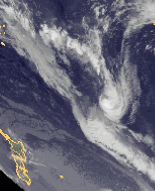 Der Tropensturm 'Joni' erreicht mittlerweile Böen bis zu 135 km/h. Er zieht weiter nach Süden und bleibt damit auf dem offenen Meer abseits bewohnter Inseln.