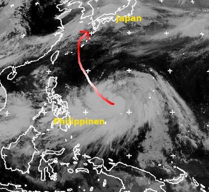 Nach den neuesten Entwicklungen hat sich der Tropensturm 'Man-Yi' über Mikronesien im Westpazifik weiter verstärkt und erreicht derzeit eine mittlere Windgeschwindigkeit von 110 km/h, in Böen bis 140 km/h. Er wandert nun langsam unter weiterer Verstärkung östlich an den Philippinen vorbei in Richtung Südküste von Japan. (Bildquelle: http://www.sat.dundee.ac.uk)