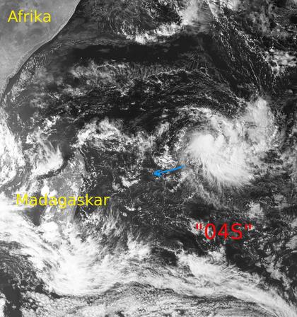 Noch recht weit östlich vor der Küste von Madagaskar zeigt das Satellitenbild von heute einen Tropensturm mit dem Codenamen '04S'. Bei Windgeschwindigkeiten von 65 km/h im Mittel und 95 km/h in Böen ist er noch schwach. Formschön zeigen sich jedoch die aus der Mitte spiralartig nach außen laufenden Wolkenbänder im Wirbelsturm. '04S' wandert nun Richtung Madagaskar weiter und verstärkt sich dabei. Ob er die Insel erreichen wird, kann man derzeit aber noch nicht vorhersagen. (Bildquelle: Copyrigt EUMETSAT, NERC Satellite Receiving Station, University of Dundee)