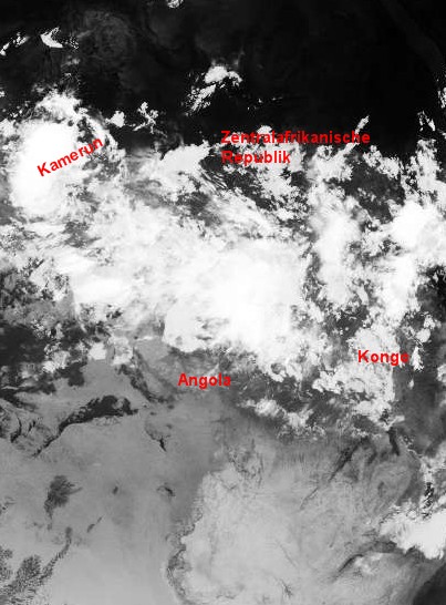 Auf dem heutigen Satelittenfoto zeigt sich ein weit ausgedehtes Wolkenpacket von Kamerun im Westen bis in den Kongo im Osten und im Norden von der zentralafrikanischen Republik bis nach Nordangola weiter im Süden. In diesem Bereich treten häufig, teils auch langanhaltende und ergiebige Niederschläge mit örtlichen Gewittern auf. Teils fallen heute bis zu 50 Liter Regen auf einen Quadratmeter.