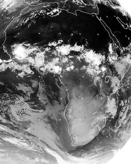 Das Satellitenbild von Afrika zeigt nördlich des Äquators, bis in die Sahelzone, die Wolkengebiete tropischer Schauer und Gewitter. Weiter nördlich über der Sahara und am Mittelmeer, gibt es kaum Wolken und auch keinen Regen. Aber auch der Süden Afrikas ist fast vollständig wolkenfrei. Mehr Wolken, die auch leichte Schauer bringen, findet man in den Ländern am Indischen Ozean. (Bildquelle: NERC Satellite Receiving Station, Dundee University, Scotland, http://www.sat.dundee.ac.uk/)