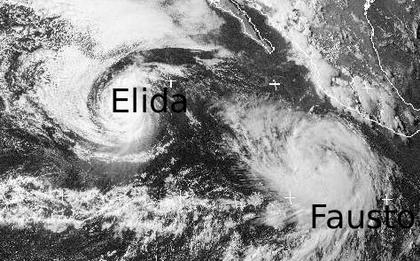 Westlich von Mexiko liegen über dem Pazifik zwei Tropische Stürme: Der ehemalige Hurrikan 'Elida' mit Böen bis 120 km/h und der neue Hurrikan 'Fausto' mit Böen bis 150 km/h. Sie ziehen jedoch beide allmählich weiter nach Westen und stellen somit keine Gefahr für bewohntes Gebiet dar.
