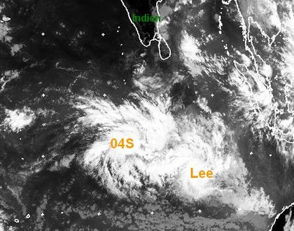 Der Ausschnitt zeigt zwei tropische Wirbelstürme, die sich über dem warmen Wasser des Indischen Ozeans entwickelt haben. Die mittleren Windgeschwindigkeiten beider Wirbelstürme erreichen zur Zeit 65, in Böen bis zu 85 km/h. Es ist noch unklar, ob sich die Stürme verstärken oder abschwächen. Berechnungen zufolge sollten sie jedoch keine bewohnte Insel überqueren. (Bildquelle: NERC Satellite Receiving Station, Dundee University, Scotland, http://www.sat.dundee.ac.uk/)