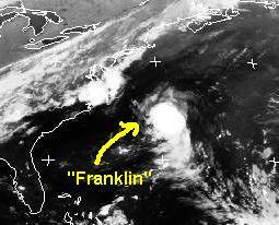 Der tropische Sturm 'Franklin' zieht zur Zeit mit Windgeschwindigkeiten von 85, in Böen 100 km/h in einiger Entfernung parallel zur Ostküste der USA weiter nach Norden. Berechnungen zufolge soll er sich wieder etwas verstärken und morgen Windgeschwindigkeiten von 100, in Böen 120 Km/h erreichen. Küstenregionen oder Inseln sind aber nicht betroffen.