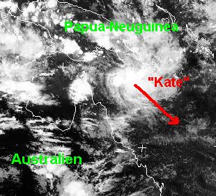 Zwischen der australischen Halbinsel Cape York und Papua-Neuguinea hat sich der tropische Sturm 'Kate' aufgewirbelt. Zur Zeit zieht er mit Windgeschwindigkeiten von 95, in Böen 120 km/h nach Südosten und soll sich noch etwas verstärken. Sein Endziel ist noch unklar.