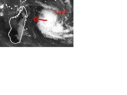 Östlich von Madagaskar hat sich dich der tropische Sturm 'Lola' aufgewirbelt. Zurzeit erreicht er mittlere Windgeschwindigkeiten von 74, in Böen 102 km/h. Berechnungen zufolge soll sich 'Lola' noch etwas verstärken und in westlicher Richtung auf Madagaskar zuziehen. Sein Endziel ist allerdings noch unklar. (Bildquelle: NERC Satellite Receiving Station, Dundee University, Scotland, http://www.sat.dundee.ac.uk/)