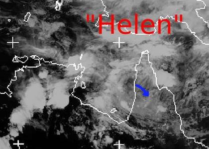 Über der Kap-York-Halbinsel im Norden von Queensland in Australien liegt am Sonntag Mittag ein tropisches Tief namens 'Helen'. Es ist an seiner Struktur mit einer wolkenfreie Zone in der Mitte und kreisförmig darum liegender Bewölkung gut zu erkennen. Während die Windgeschwindigkeiten nur bei etwa 60 km/h liegen (in Böen bei 75 km/h), bringt aber es aber ergiebige Niederschläge mit sich. 'Helen' wandert nun in südöstlicher Richtung weiter und wird sich vermutlich an Land abschwächen. (Bildquelle: NERC Satellite Receiving Station, Dundee University, Scotland, http://www.sat.dundee.ac.uk/)