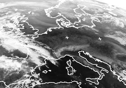 Auf dem Satellitenbild vom morgen sind über Deutschland wie auch bis nach Italien und Südosteuropa keine Wolken zu erkennen. Mehr Wolken findet man im Bereich eines Tiefs über der Biskaya. In der schwülen Luft über Frankreich bilden sich heute schon kräftige Gewitter. Die Luftmasse zieht langsam nach Osten, sodass es an den kommenden Tagen auch in Deutschland gewittriger wird. (Bildquelle: NERC Satellite Receiving Station, Dundee University, Scotland, http://www.sat.dundee.ac.uk/)