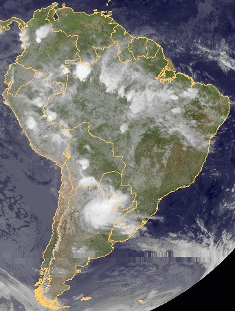 Auf dem heutigen Satellitenfoto ist über dem Norden von Argentinien ein kräftiger Tiefdruckwirbel zu sehen. Unter dieser meist sehr hochreichenden Quellbewölkung kommt es verbreitet zu kräftigen, teils auch unwetterartigen und gewittrigen Regenfällen.