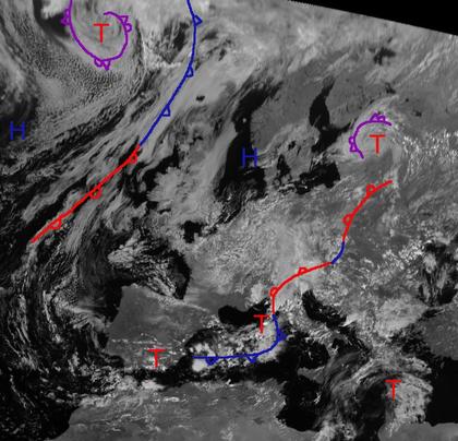 Hoch 'Petra' liegt heute über der Nordsee und sorgt für Wolkenlücken vor allem über Skandinavien. Über Mitteleuropa herrscht dagegen vielfach starke Bewölkung, hier bringt ein nur in der Höhe ausgebildetes Tief wechselhaftes Wetter. Am Mittelmeer finden sich unter Tiefdruckeinfluss einige Schauer- und Gewitterwolken, vor allem von den Balearen bis nach Norditalien sind sie teils stark ausgeprägt. Ein Tief liegt auch über dem Atlantik, Mitteleuropa erreicht es aber voraussichtlich nicht.