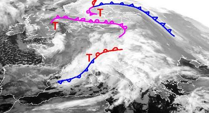 Tiefdruckgebiete im Norden und Westen Europas, sowie über dem Mittelmeer sorgen für viele Wolken und zeitweise Niederschläge in weiten Teilen von Europa. Lediglich in Spanien und Portugal setzt sich von Südwesten her langsam Hochdruckeinfluss durch.