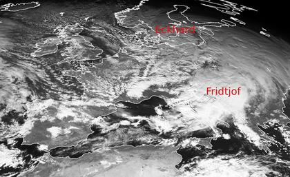 Am Montag Mittag liegt in Südosteuropa das Sturmtief 'Fridtjof' mit seinen dichten Wolken und Regen von Italien bis nach Russland. In Mitteleuropa ist es unterschiedlichen bewölkt, häufig zeigt sich an den zerstreuten Wolkenverteilungen Schauerbewölkung, die auf der Rückseite von Tief 'Fridtjof' von Nordwesten hereinzieht. Tief 'Eckhard' sorgt von Skandinavien bis nach Polen für stärkere Bewölkung, somit ist es auch hier wechselhaft. (Bildquelle: NERC Satellite Receiving Station, Dundee University, Scotland, http://www.sat.dundee.ac.uk/)