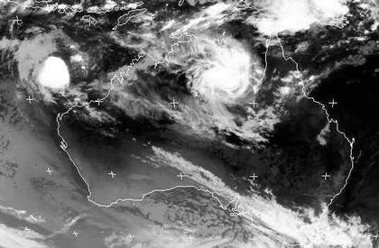 Das Satellitenbild zeigt den Wirbelsturm 'Harvey' an der Küste vom Carpentaria-Golf in Nordaustralien, in der Nacht zu Dienstag ist er mit Windgeschwindigkeiten von 90, in Böen bis zu 120 km/h auf das Land getroffen und schwächt sich dabei schnell ab. Nordwestlich von Australien erkennt man das Tief 17S; seine Windgeschwindigkeit beträgt zur Zeit 65, in Böen 80 km/h. Es ist noch unklar ob es sich zu einem Taifun entwickelt oder nicht.