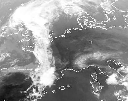 Während Deutschland wolkenfrei ist, erkennt man über Frankreich das Wolken band der Kaltfront des Tiefs Quirin bei Schottland. Es zieht heute nach Deutschland und bringt im Westen Gewitter.