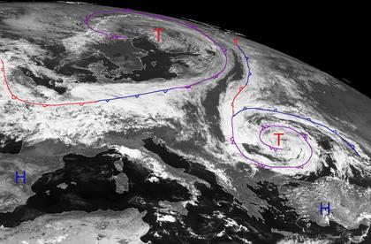Zwei größere Tiefdrucksysteme bestimmen mit ihren Wolken das Wetter in weiten Teilen Europas. So bringt das Tief 'ex-Laura' Wolken von Nordskandinavien über das Baltikum bis nach Nordfrankreich. Ein weiteres Tief liegt über Südosteuropa, seine Okklusion hat sich dabei schon weit 'eingekringelt', was ein Zeichen für ein fortgeschrittenes Tief ist. Zwischen den Tiefausläufern zeigen sich Zonen geringer Bewölkung, insbesondere in einem Streifen von Südostpolen bis nach Russland, aber auch von der östlichen Nordsee bis zur Ostsee. Im Süden sorgt Hochdruckeinfluss ebenfalls für wolkenarmes Wetter. (Bildquelle: Copyrigt EUMETSAT, NERC Satellite Receiving Station, University of Dundee)