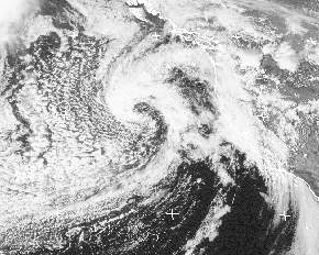 Westlich von Kalifornien liegt der Wolkenwirbel eines Tiefdruckgebiets. Auf seiner Westseite wird kalte Luft nach Süden transportiert, man erkennt das aufgelockerte Muster der Schauerbewölkung. An der Küste strömt dagegen Warmluft nach Norden. Bei der Bewölkung im Küstenbereich handelt es sich meist um Nebel oder Hochnebel, der sich über dem kalten Wasser gebildet hat. Die Wolken über den Bergen im Landesinneren dagegen gehören zu örtlichen Schauern und Gewittern. (Bildquelle: NERC Satellite Receiving Station, Dundee University, Scotland, http://www.sat.dundee.ac.uk/)