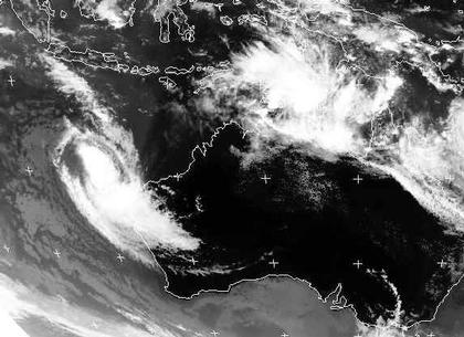 Zwei Taifune toben sich zur Zeit bei Australien aus. Der eine von ihnen mit dem Namen 'Willi' (links im Bild) streift mit Windgeschwindigkeiten von 166, in Böen bis 200 km/h die Nordwestküste Australiens. Der Taifun 'Ingrid' zieht heute entlang der Küste vom Arnhemland westwärts, in Böen erreichen seine Windgeschwindigkeiten bis zu 270 km/h. Nach den neuesten Berechnungen erreicht er am Sonntag Darwin, bis dahin schwächt er sich nur wenig ab.