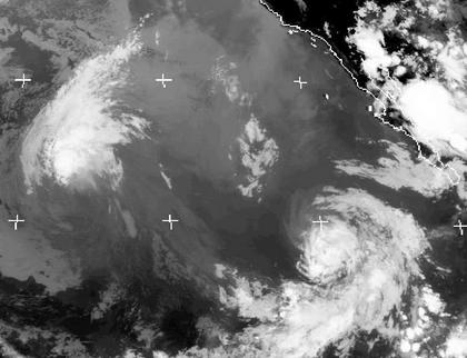 Zwei Tropenstürme sind zurzeit auf dem Pazifik vor der mexikanischen Küste westwärts unterwegs. Bei Tropensturm 'Carlotta' rechts unten im Bild ist immerhin noch ein Auge zu erahnen. Der Sturm erreicht am Sonntagmorgen noch Böen bis zu 100 km/h, wird aber immer schwächer. Noch weiter in Auflösung begriffen ist das tropische Tiefdruckgebiet 'Bud', es bringt nur noch bis zu 65 km/h zustande, in den nächsten Tagen wird er ganz verschwinden.