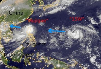 Tropensturm 'Mujigae' liegt heute über den nördlichen Phlippinen. Während der Wind bei 50 km/h (in Böen bis 65 km/h) kaum eine Rolle spielt, fällt aber teils sehr ergiebiger Regen. Weiter östlich auf dem Pazifik hat sich bereits eine neue Tropenstörung gebildet. Ihr wurde bisher nur ein Codename gegeben ('15W'), bei Windgeschwindigkeiten um 50 km/h ist der Wirbelsturm auch eher noch schwach. Allerdings wird sich '15W' in den nächsten Tagen zu einem Taifun verstärken, einen Namen bekommen und voraussichtlich auf die Philippinen zuziehen.