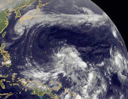 Auf dem Satellitenbild sind zwei tropische Stürme im Pazifik erkennbar. Südlich von Japan befindet sich 'Lupit', nordwestlich von Hawaii befindet sich 'Neki'. Beide Stürme ziehen in Richtung Nordosten und in beiden Stürmen werden Windgeschwindigkeiten von ca. 90 km/h erreicht.