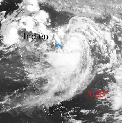 Über dem östlichen Indien liegt der Zyklon mit der Kennung '02B'. Er erreicht Windgeschwindigkeiten von 65 km/h im Mittel und 85 km/h in Böen. Der Wind erreicht also nur eine recht schwache Stärke, dafür fällt aber teils sehr ergiebiger Regen. Über dem Land wird sich der Zyklon in den nächsten Tagen langsam abschwächen. (Bildquelle: Copyrigt EUMETSAT, NERC Satellite Receiving Station, University of Dundee)