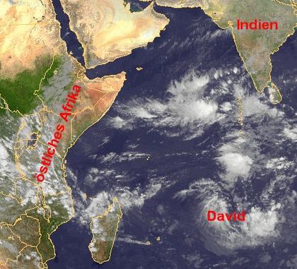 Auf dem heutigen Satellitenfoto ist der Zyklon 'David' über dem Indischen Ozean auszumachen. Im Zyklongebiet treten verbreitet Windgeschwindigkeiten um 70 km/h, in Böen auch 90 km/h auf und es kommt verbreitet zu teils kräftigen Niederschlägen.