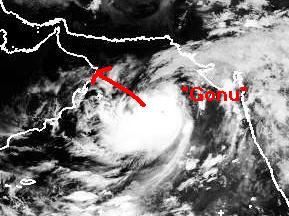 Auf dem Satellitenbild von Montag früh ist der Zyklon 'Gonu' über dem Arabischen Meer gut zu erkennen. Zurzeit erreicht er mittlere Windgeschwindigkeiten von 213, in Böen 260m/h und zieht in nordwestlicher Richtung auf die Nordostküste von Oman zu. Berechnungen zufolge soll er sich jedoch etwas abschwächen. (Bildquelle: NERC Satellite Receiving Station, Dundee University, Scotland, http://www.sat.dundee.ac.uk/)