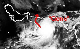 Auf dem Satellitenbild von Dienstag früh ist der Zyklon 'Gonu' im Arabischen Meer gut zu erkennen. Zurzeit erreicht er mittlere Windgeschwindigkeiten von 250, in Böen 305km/h und bewegt sich Richtung Nordosten auf die Arabische Halbinsel zu. Berechnungen zufolge soll er sich jedoch etwas abschwächen, nördlich an der Küste von Oman vorbeiziehen, und am Donnerstag auf die Südküste von Iran treffen. (Bildquelle: NERC Satellite Receiving Station, Dundee University, Scotland, http://www.sat.dundee.ac.uk/)
