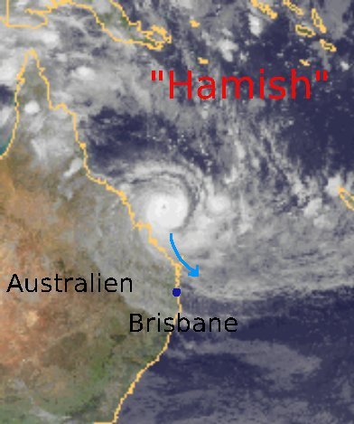 Der Zyklon 'Hamish' hat sich seit gestern etwas weiter nach Südosten bewegt und bleibt gefährlich. Er erreicht einen Mittelwind von 120 km/h, in Böen von etwa 280 km/h. Daneben kommt es zu teils heftigen Niederschlägen. Auch das Auge ist weiterhin vorhanden. 'Hamish' zieht weiter nach Südosten auf die Fraserinsel zu, möglicherweise wird auch Brisbane zumindest vom Randbereich des Wirbelsturms erfasst.
