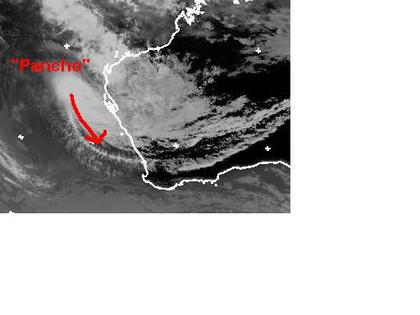 Der Zyklon 'Pancho' vor der Westküste Australiens erreicht zurzeit mittlere Windgeschwindigkeiten von 167, in Böen 204 km/h und hat sich damit im Vergleich zu gestern etwas verstärkt. Berechnungen zufolge soll er sich jetzt jedoch abschwächen und weiter Richtung Süden ziehen. Die Westküste Australiens wird von seinen Ausläufern zwar gestreift, die zu erwartenden Windgeschwindigkeiten halten sich jedoch in Grenzen. (Bildquelle: NERC Satellite Receiving Station, Dundee University, Scotland, http://www.sat.dundee.ac.uk/)