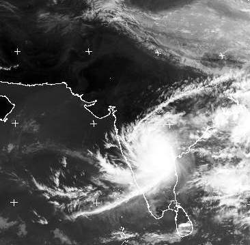 Ein Zyklon liegt über Südindien und bringt dort Regenfälle und Sturmböen. Der Norden Indiens ist dagegen wolkenfrei.