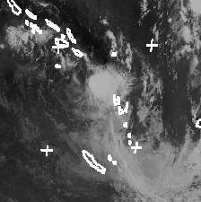 Westlich von Vanuatu liegt der Zyklon 'Yani' mit einer mittleren Windgeschwindigkeit von nur noch 55km/h und Böen bis 75 km/h. Damit hat er sich deutlich abgeschwächt. Er wird sich nun voraussichtlich auflösen. (Bildquelle: NERC Satellite Receiving Station, Dundee University, Scotland, http://www.sat.dundee.ac.uk/)