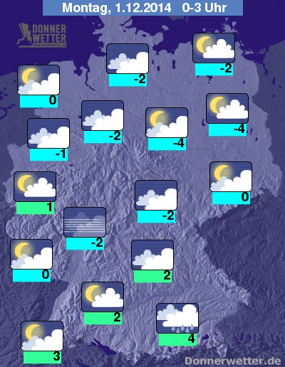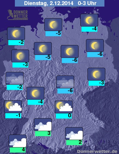 Bis zum Anfang der kommenden Woche (und auch noch darüber hinaus) sinken die Nachttemperaturen stetig ab. Richtig kalt wird es dann vor allem entlang der Mittelgebirge, in der Nacht auf Dienstag sinkt das Quecksilber hier örtlich auf Werte um -6 Grad C.