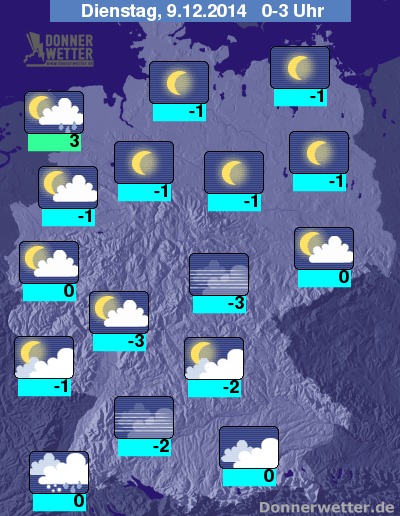 Niederschlagsreicher geht es dann in der Nacht auf Montag zu. In der Nordhälfte fallen die Niederschläge zumeist als Regen, in der Südhälfte auch als Schneeregen oder Schnee. Tiefstwerte um 4 Grad C in Ostfriesland und um -1 Grad C im Thüringer Wald.