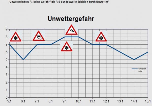 Die Unwettergefahr für die kommende Wetterwoche ist erhöht, denn bei einer teils kräftigen West- bis Nordwestwindströmung ziehen häufig nasskalte Luftmassen nach Deutschland, die vor allem im Süden und Osten für zeitweise Glätte durch Schneefall sorgen, aber auch sonst besteht verbreitet Glättegefahr durch teils überfrierende Nässe, gefrierenden Regen oder Schneeregen. Zusätzlich zieht voraussichtlich am Freitag ein Sturmtief auf, dabei kann es vor allem an den Küsten und auf den Hochlagen der Mittelgebirge zu möglichen Orkanböen kommen, aber auch im Flachland wird ein kräftiger bis stürmischer Wind erwartet.