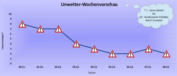 In die nächste Woche geht es, nach den aktuellen Prognosemodellen, verbreitet stürmisch, dabei herrscht vor allem an den Küsten und auf den Norddeutschen Mittelgebirgen vielfach auch schwerer Sturm mit orkanartigen Böen, aber auch im Flachland sind oft schwere Sturmböen möglich. Am Dienstag und Mittwoch beruhigt sich die Lage vor allem in der Mitte und im Süden deutlich, im Norden herrscht jedoch weiterhin sehr stürmisches Wetter. Erst ab Donnerstag wird es auch im Norden deutlich ruhiger und es herrscht auch hier meist trockenes, teils aber auch noch windiges Hochdruckwetter. Zum Wochenende bleibt es dann bei dem meist trockenem und teils auch freundlichen Wetter.