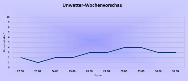 Besonders bis einschließlich Donnerstag bleibt die Gefahr durch Gewitter weitgehend gering, jedoch herrscht im Land verbreitet heißes Wetter mit Temperaturen von 30 Grad C und darüber hinaus. Ab Freitag ist regional auch wieder mit einzelnen Schauern und zum Teil kräftigen Gewittern zu rechnen. Freundliches Sommerwetter bleibt jedoch vorherrschend und die Unwettergefahren bleiben überwiegend leicht bis mäßig.