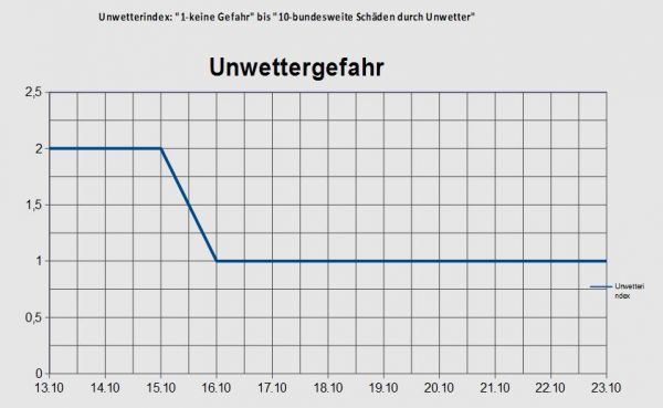 Das Risiko vor Gewittern ist in den kommenden Tagen nur noch leicht bis mäßig, ab Mitte Oktober nimmt das Gewitterpotential voraussichtlich noch weiter ab und ist nachfolgend nur noch als gering einzuschätzen. Sturm ist in den nächsten Wochen ebenfalls kein großes Thema, jedoch sorgen atlantische Tiefausläufer für zeitweise windiges Wetter. An den Küsten der Nord- und Ostsee können tageweise auch mal kräftige Winde mit mögichen stürmischen Böen wehen.